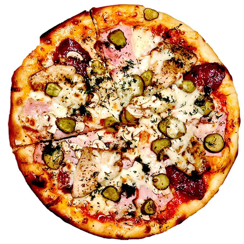 Куриное филе, колбаса с/в, карбонад к/в, грудинка к/в, маринованный огурец, свежие шампиньоны, фирменный соус для пиццы, чесночное масло, сыр Пармезан, сыр Моцарелла, тонкое тесто.