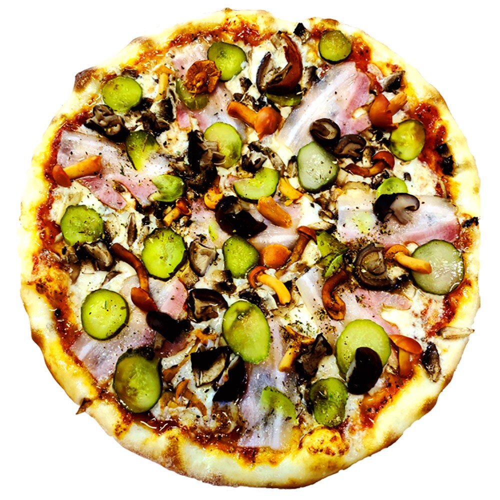 Маринованные опята и грузди, свежие шампиньоны, грудинка к/в, красный лук, маринованный огурец, сыр Моцарелла, томатный соус для пиццы, чесночное масло, тонкое тесто.