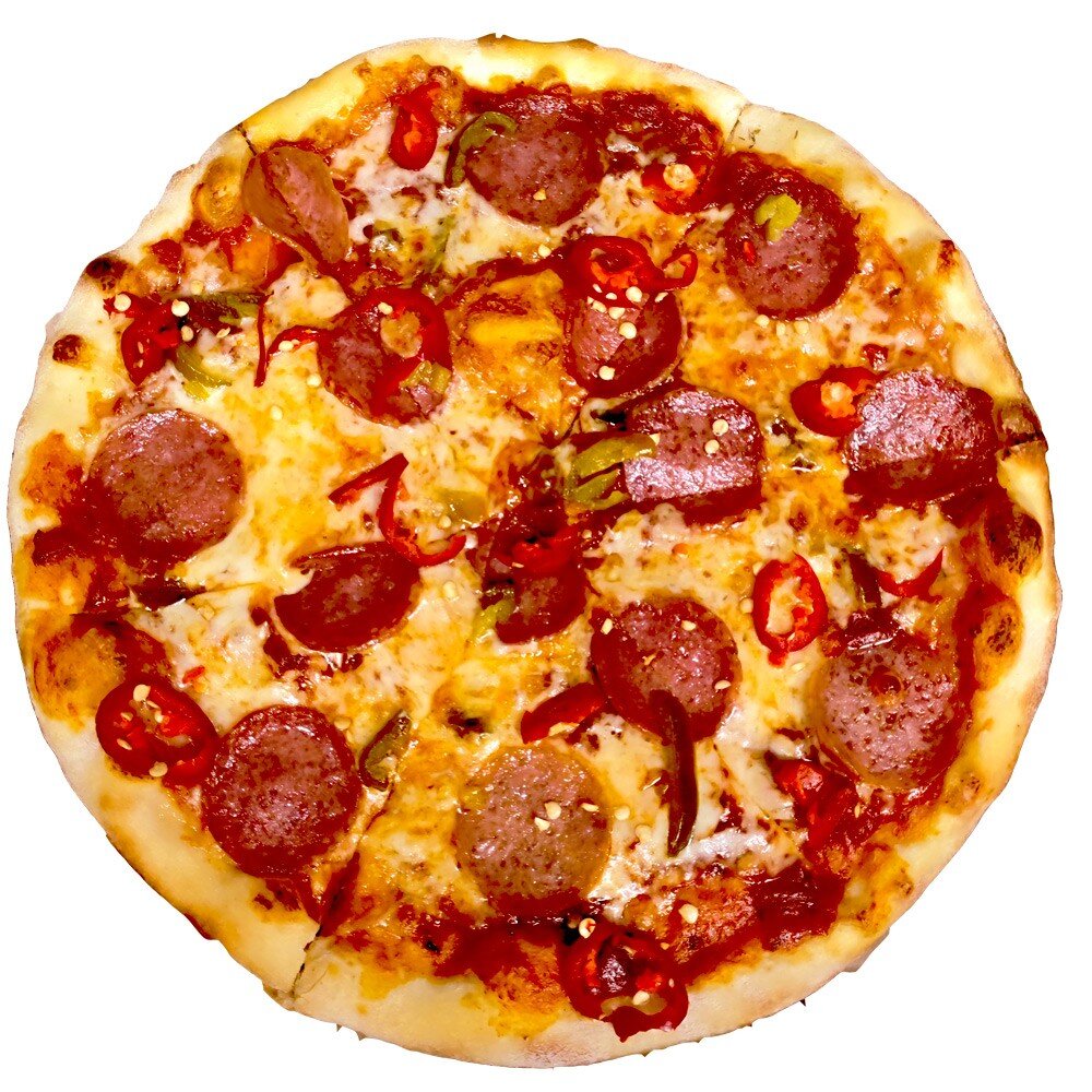 Острый фирменный соус (Первый уровень остроты), колбаска с/в, перец Халапеньо, сыр Моцарелла, томатный соус для пиццы, чесночное масло, тонкое тесто.
