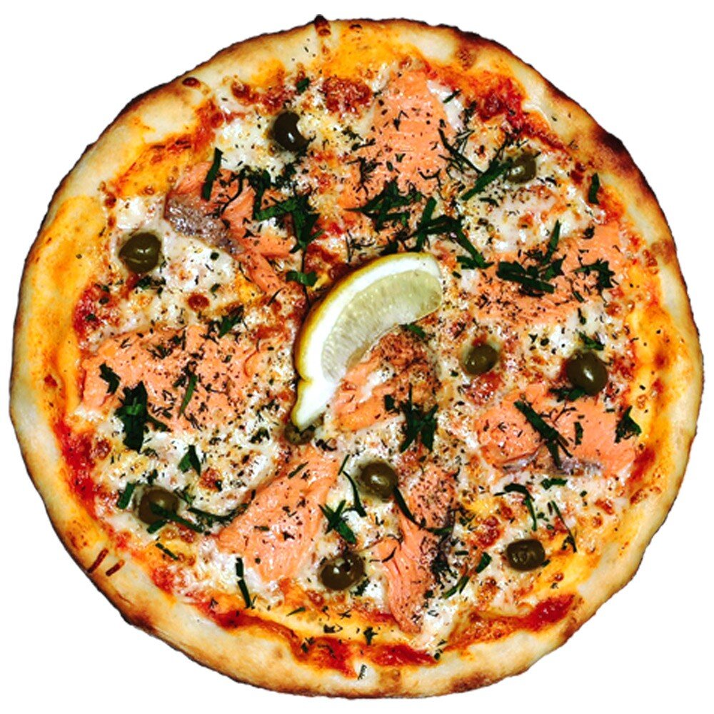 Семга слабосоленая, оливки, сыр Моцарелла, чесночное масло, томатный соус для пиццы, тонкое тесто