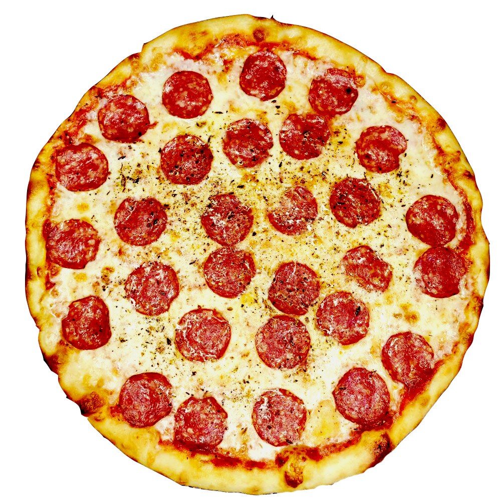 Колбаска с/в (не острая), сыр Моцарелла, томатный соус для пиццы, чесночное масло, тонкое тесто