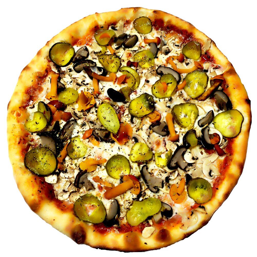 Маринованные опята, свежие шампиньоны, маринованные грузди, маринованный огурец, сыр Моцарелла, чесночное масло, фирменный соус для пиццы.
